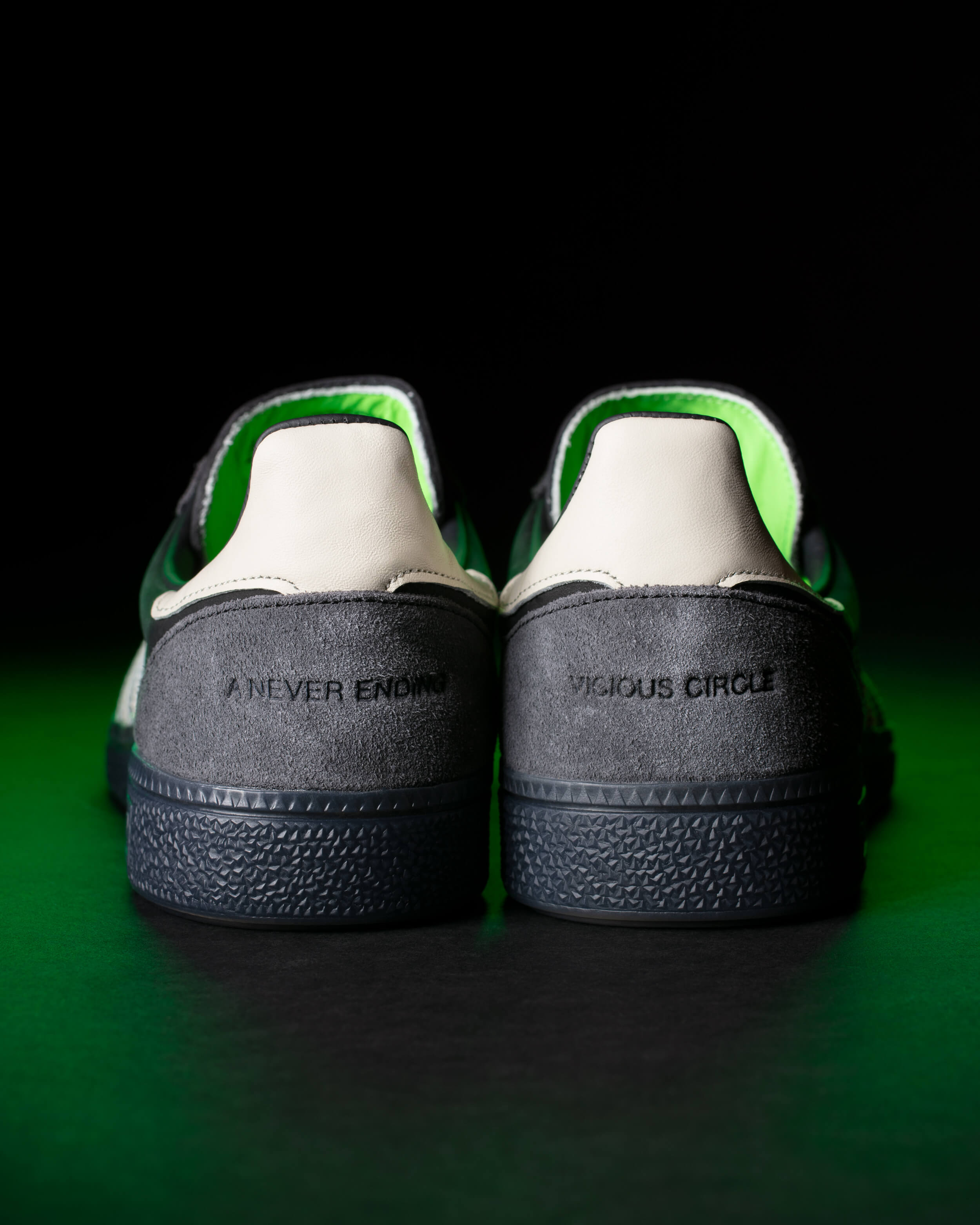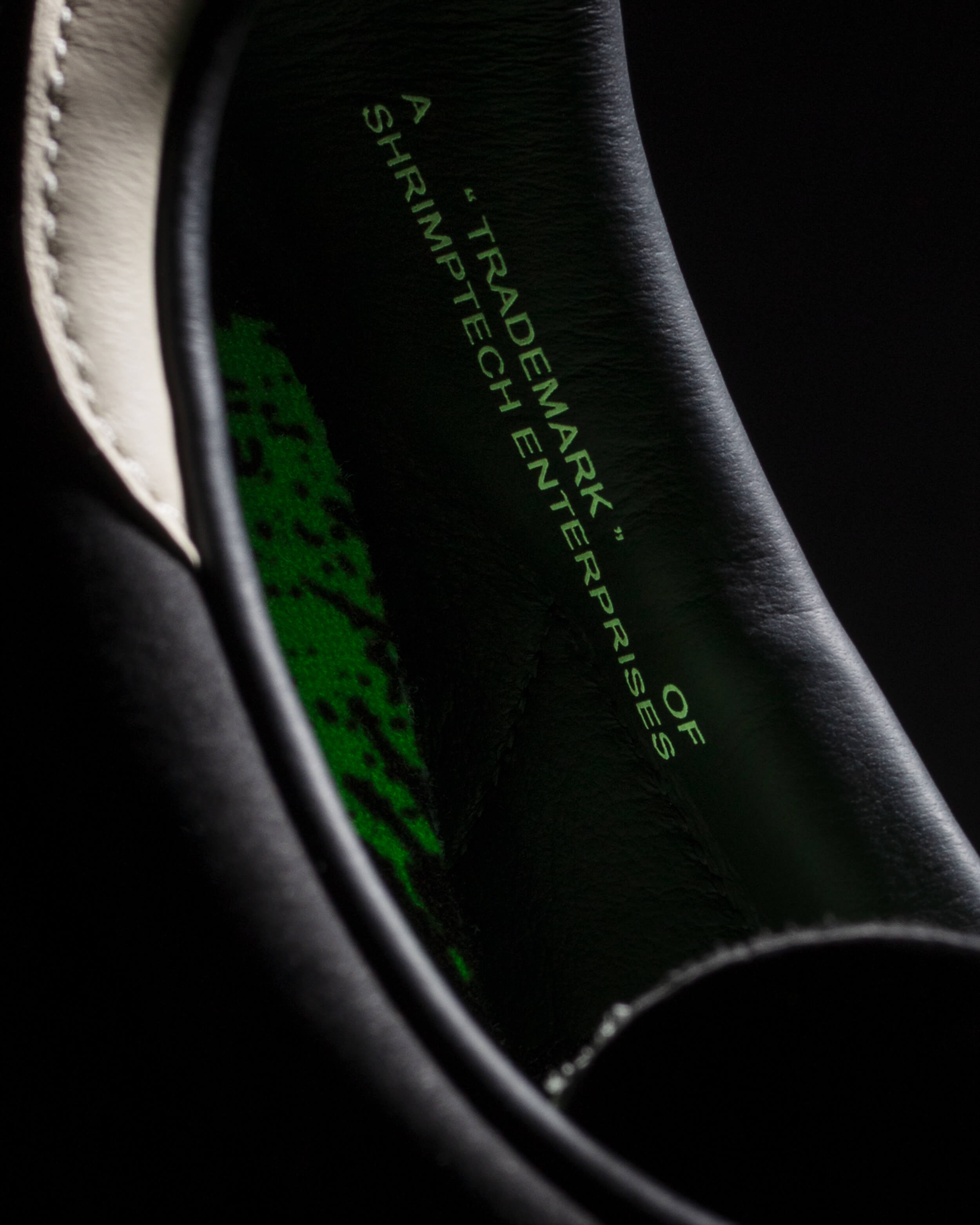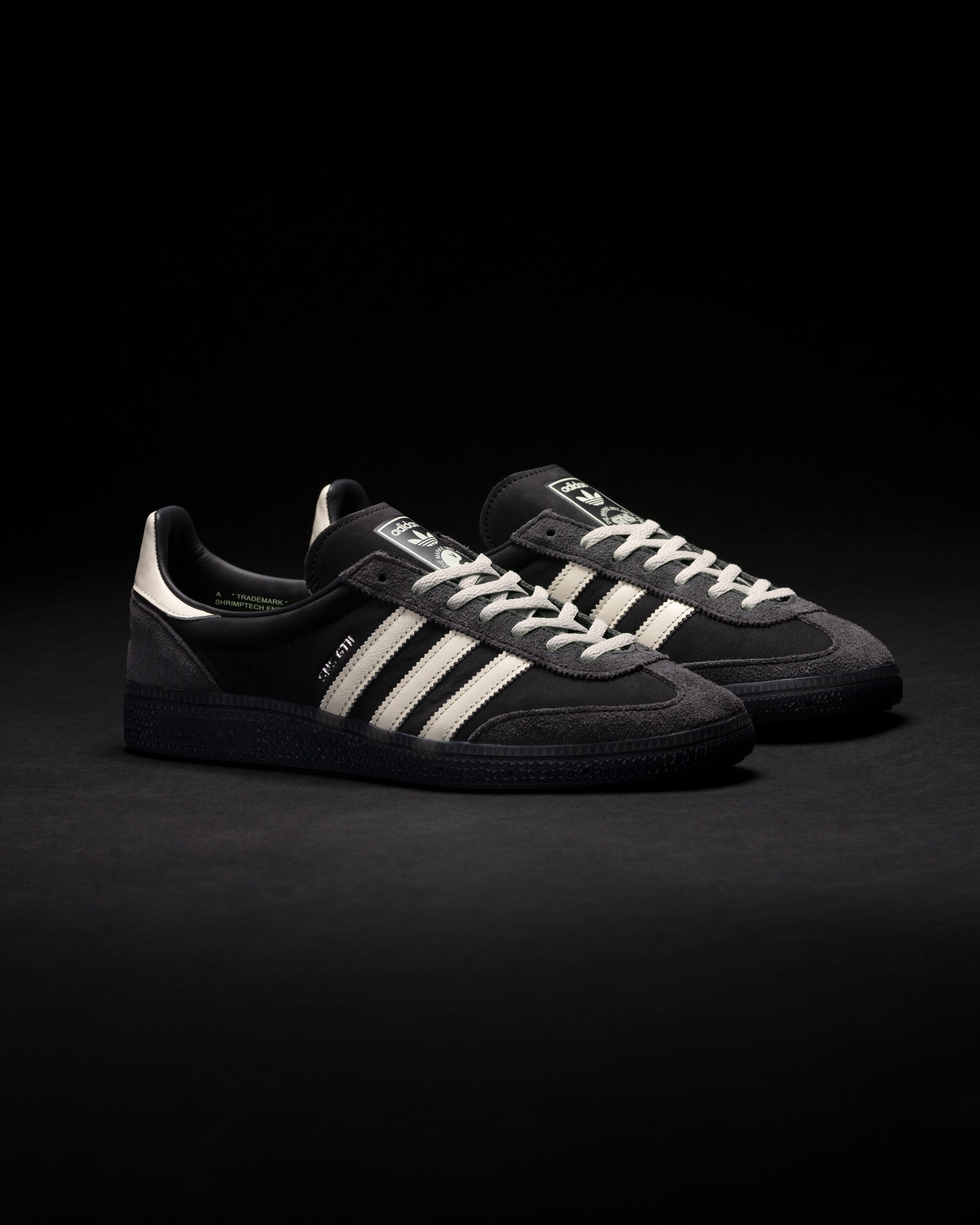 At first glance, the SNS GT II “Viagra Boys Edition” keeps things classic with tumbled leather, velour suede overlays, and vintage-style laces. But look closer and you’ll find the details that give it its character: heel tabs that read Never Ending Vicious Cycle, a Shrimptech “sample stamp” inside, and subtle nods to the band’s twisted humor throughout.