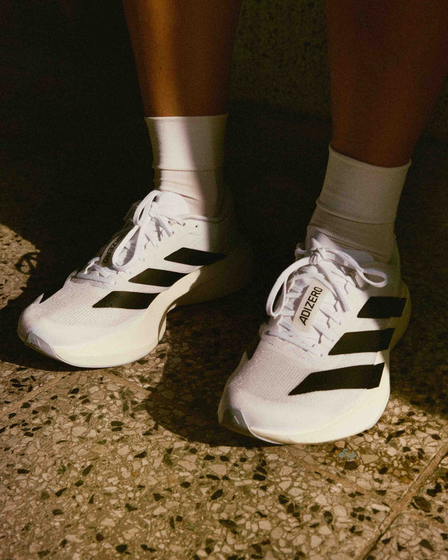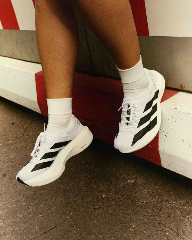 The lightest training shoe in adidas' entire running line, weighing approximately 188g for women and 224g for men, the Adizero Evo SL references its predecessor with a minimalist white finish, highlighted by clean lines and bold black three-stripes blur as the runner gains velocity. Underneath its engineered mesh upper, the Adizero Evo SL features a full-length, high-stack Lightstrike Pro midsole, offering maximized comfort and cushioning for optimal energy return.