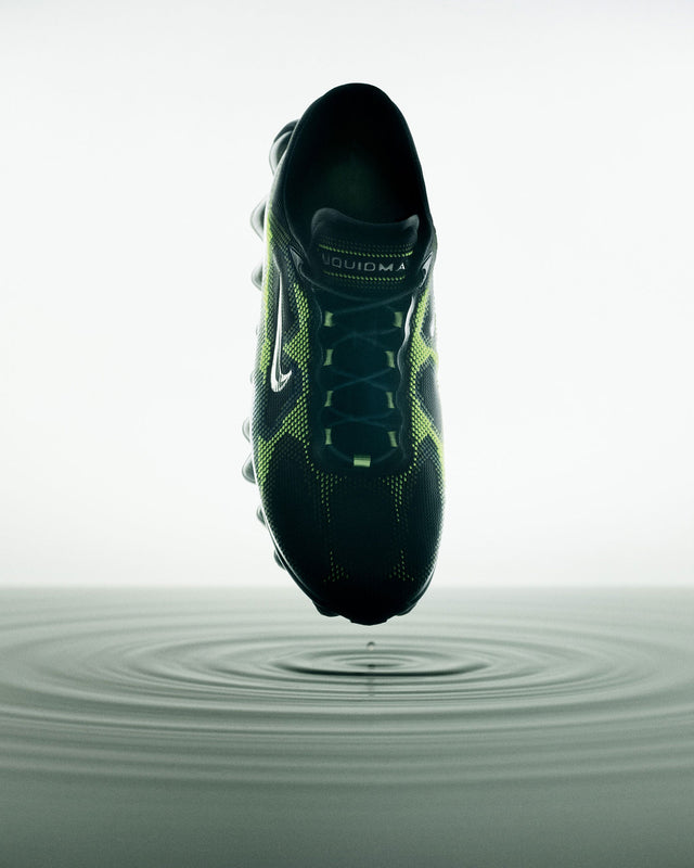 Inspired by the poison dart frog, it features a low-profile upper with textured 3-layer printing, striking green tones, a chrome Swoosh, and a translucent rubber outsole.
