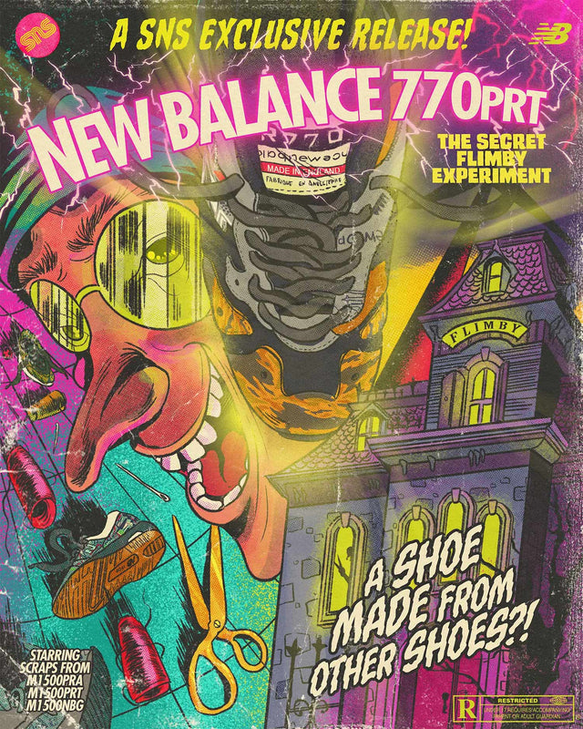 V : First of all, I want to thank the SNS creative team for the navigation and for giving me ultimate creative freedom. Our idea was to visualize the making of the New Balance 770PRT (which I think looks bomb, by the way) as this mad Frankenstein type of project. Because it’s made with scrap material from other shoes, right? So we made these illustrations inspired by vintage movie posters with a light horror-esque theme around the creation of the shoe itself.