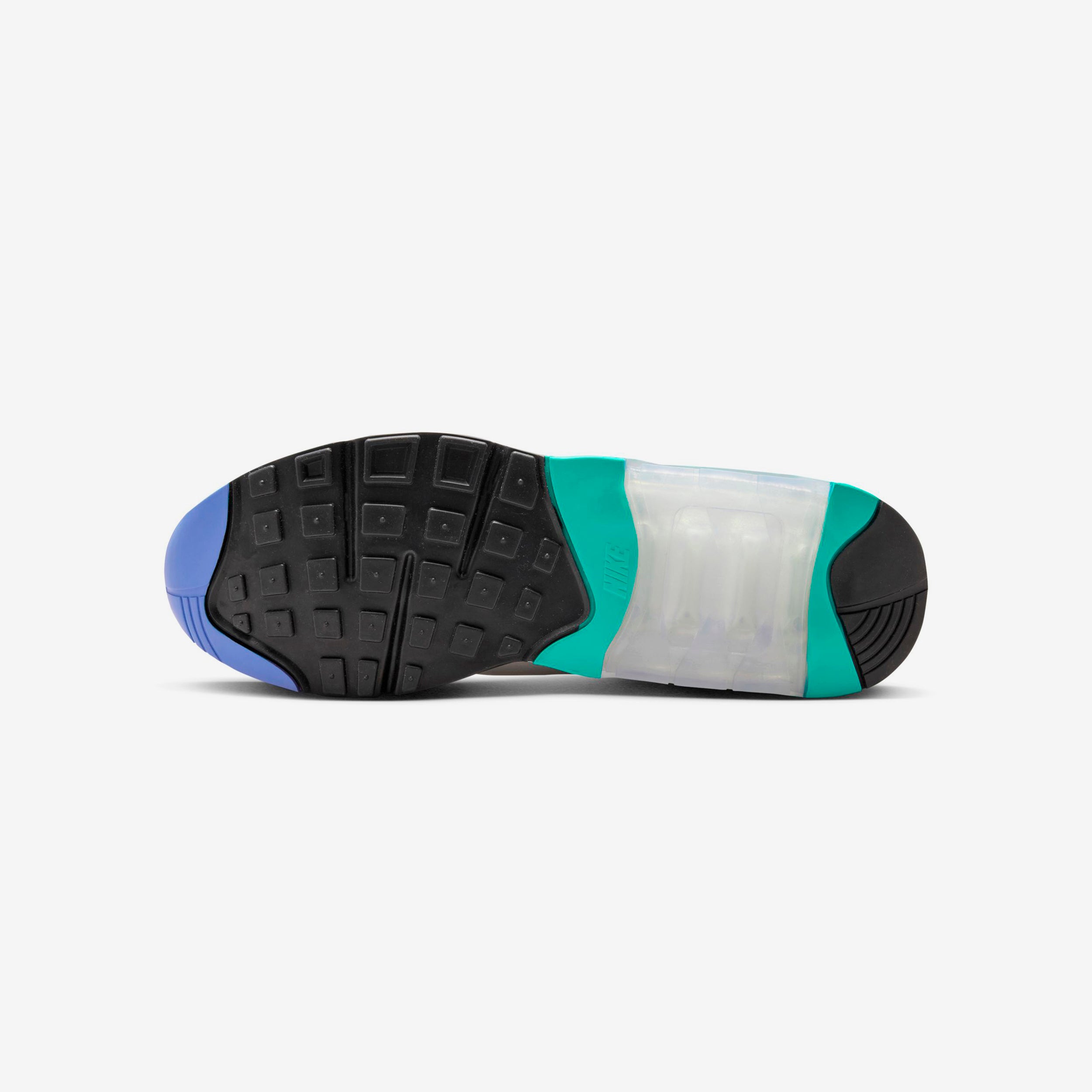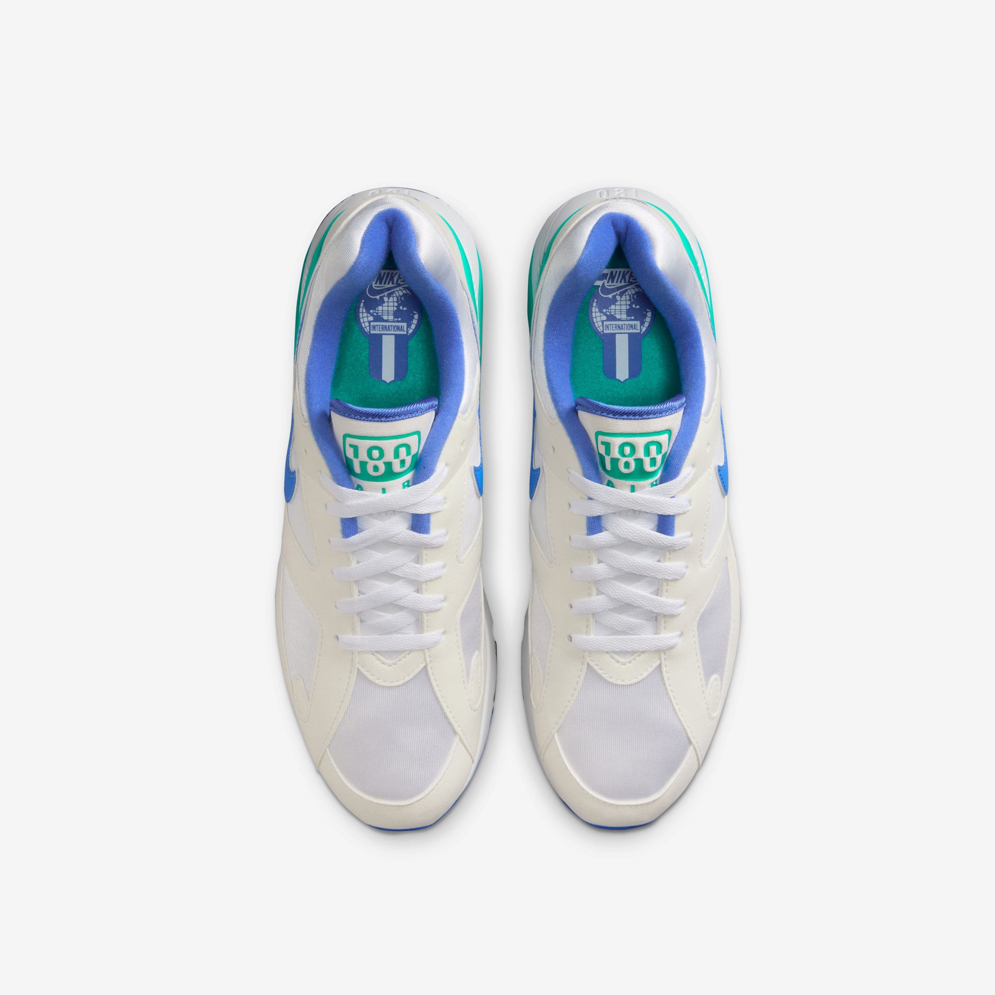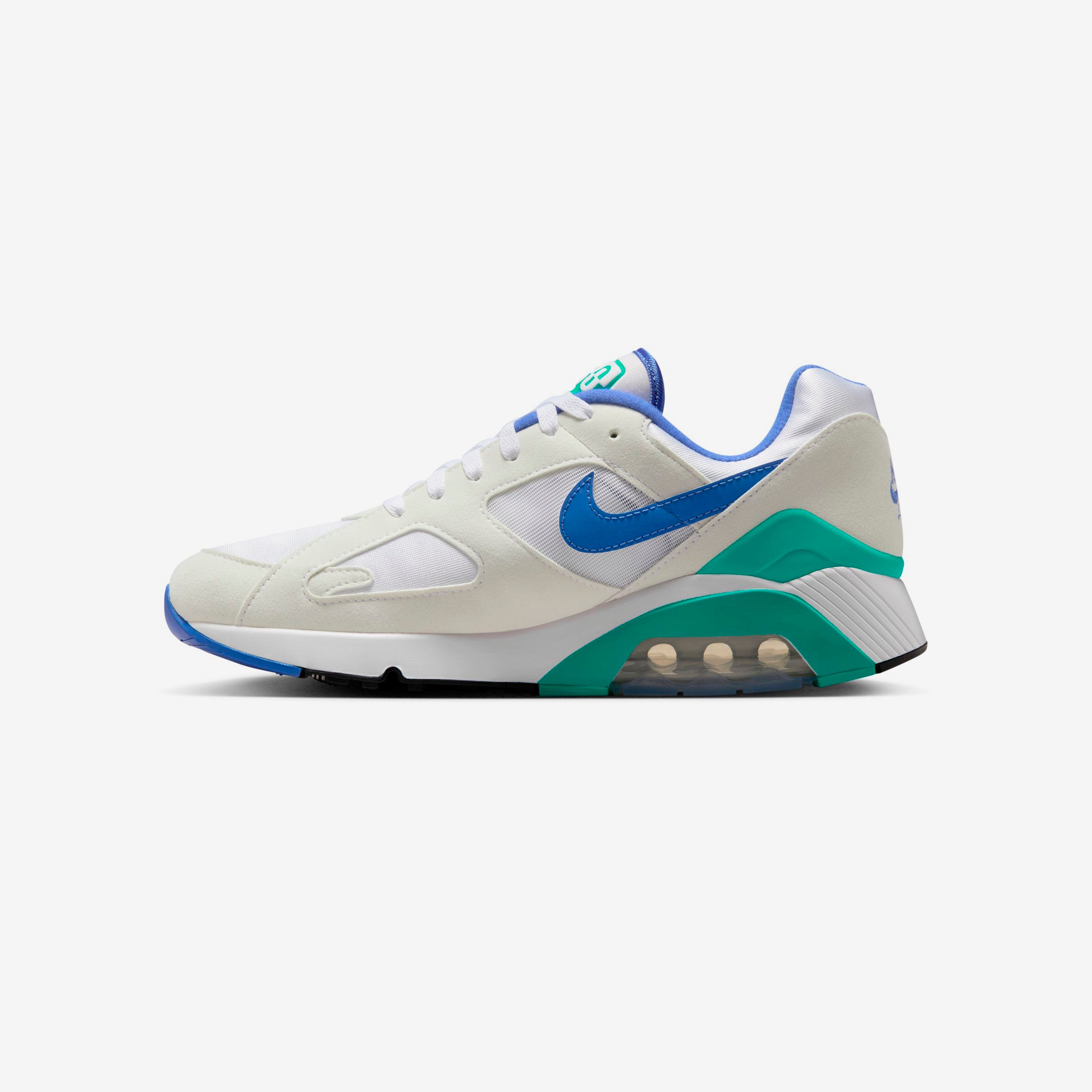 After originally launching in 1991, the Nike Air 180 is back, better than ever, in an eye-catching "White and Medium Blue” colorway. Combining white, medium blue, cream, and clear jade accents, the redesigned upper and signature 180-degree Air unit come together in an updated execution, with classic branding on the tongue label, heel counter, and insole finishing the iconic design.