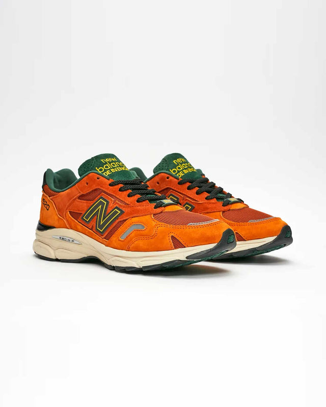 The Flimby factory-made SNS x New Balance 920 offers a combination of premium pigskin suede and mesh in bright orange and forest green color scheme, with yellow/black/3M detailing. Equipped with an ENCAP cushioning midsole and an overall retro sports style theme, the SNS x New Balance 920 offers a retro vibe for running fans or New Balance heads on the lookout for rarities.