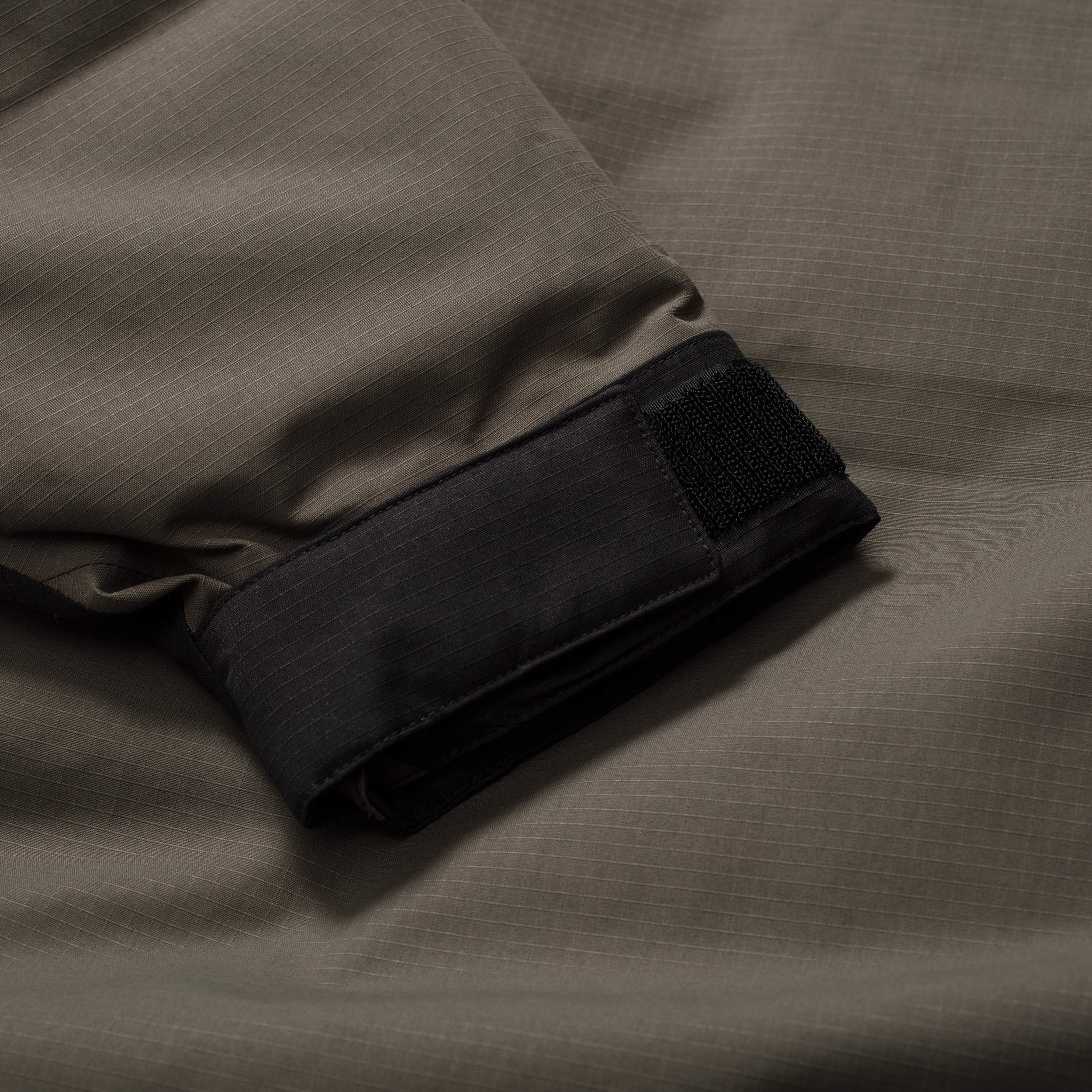 - Attached, lay-flat, adjustable hood with a cinch-cord with cord locks