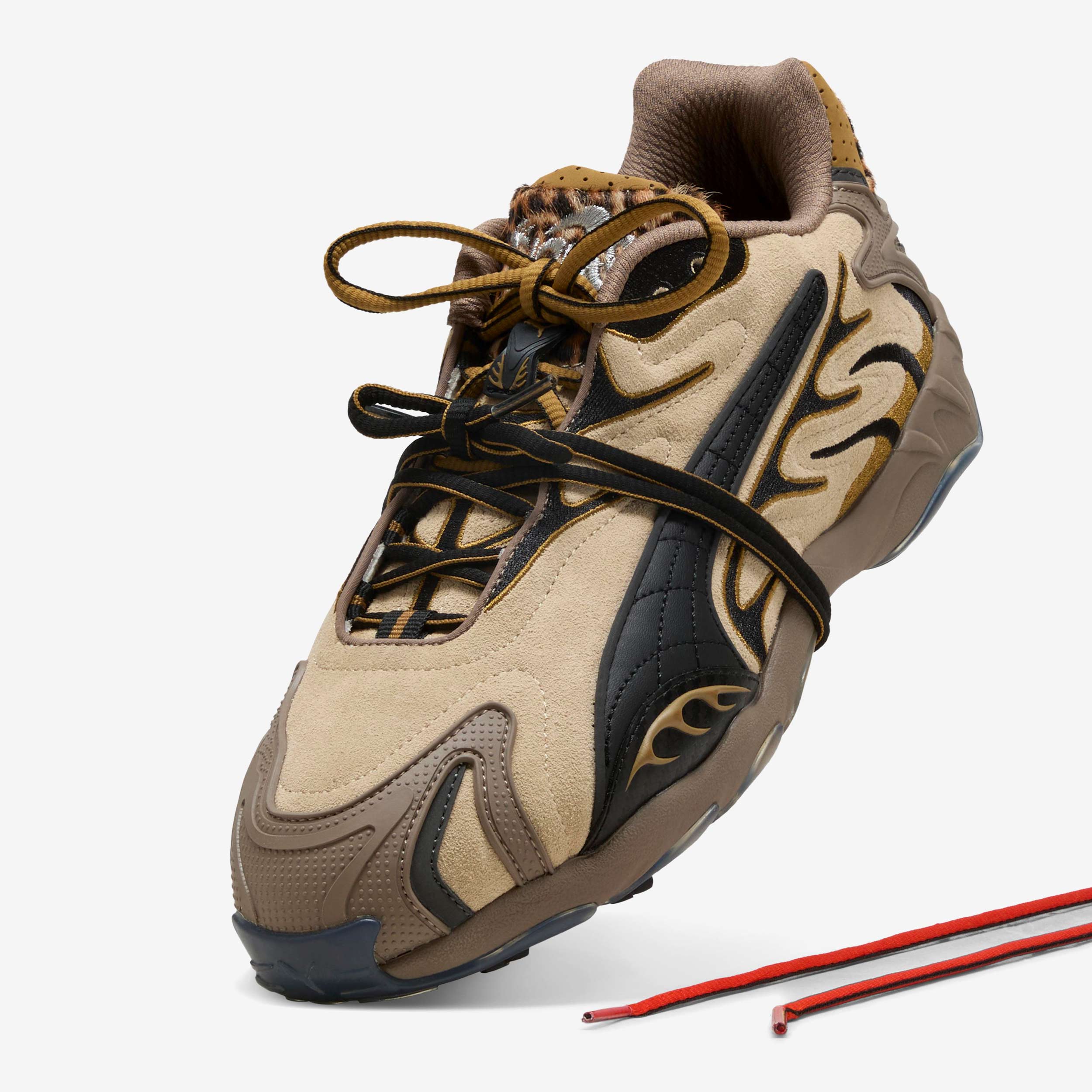 PUMA and A$AP Rocky present a refined reinterpretation of the Inhale silhouette. The Inhale Leopard features a mix of leather, synthetic, textile, and faux fur panels, creating a layered texture that adds depth and interest. Subtle leopard print accents on the tongue and heel introduce a touch of boldness, while the sculpted overlays and cushioned midsole offer both style and comfort.